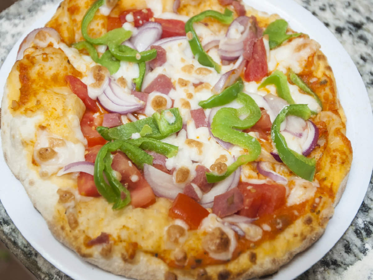पिज़्ज़ा सॉस, प्याज़, शिमला मिर्च, टमाटर, मोज़ेरेला, ऑरेगैनो, चिली फ्लेक्स, नमक और काली मिर्च का उपयोग करके बनाई गई यह पिज़्ज़ा रेसिपी एकदम लाजवाब है।